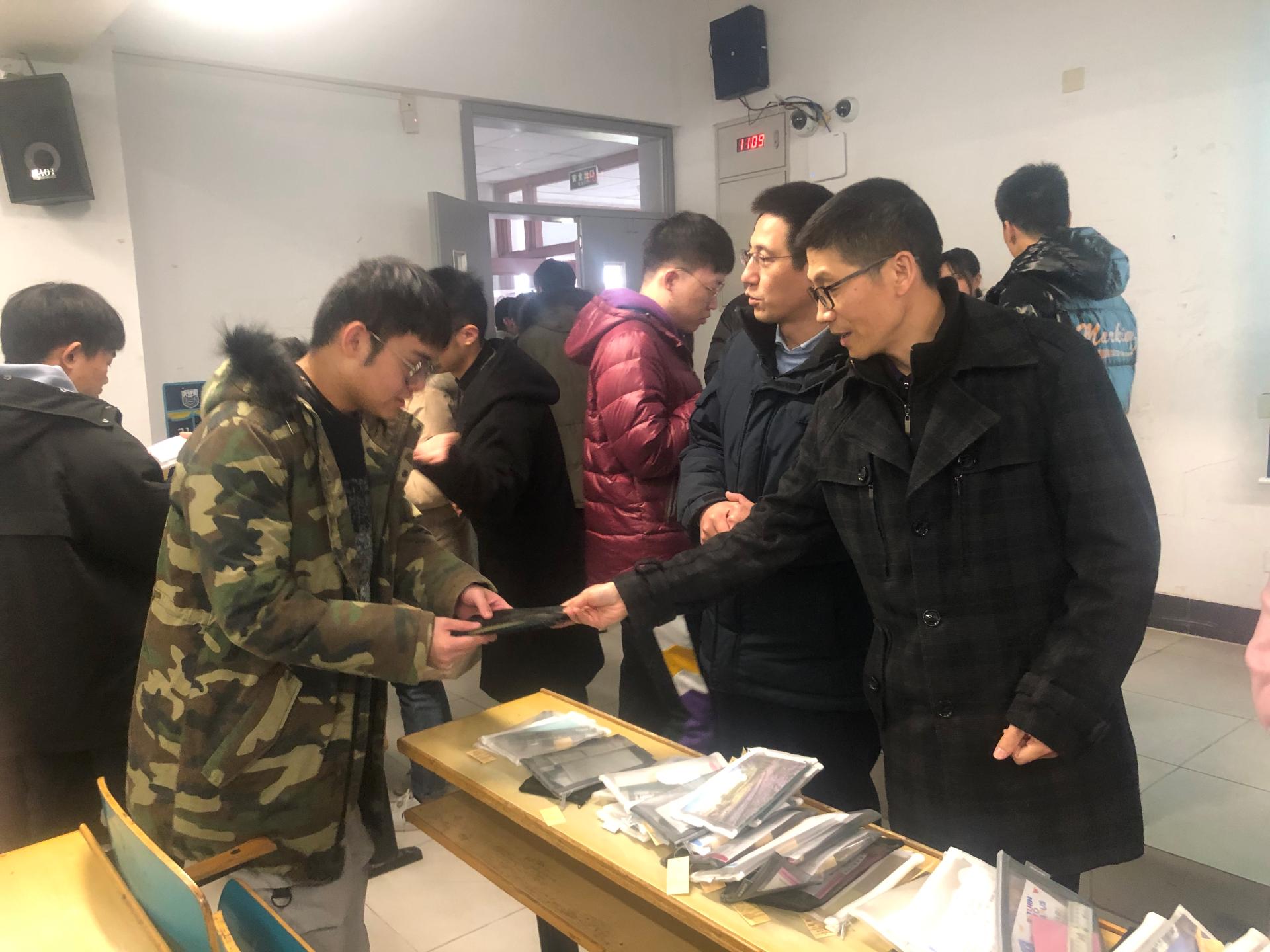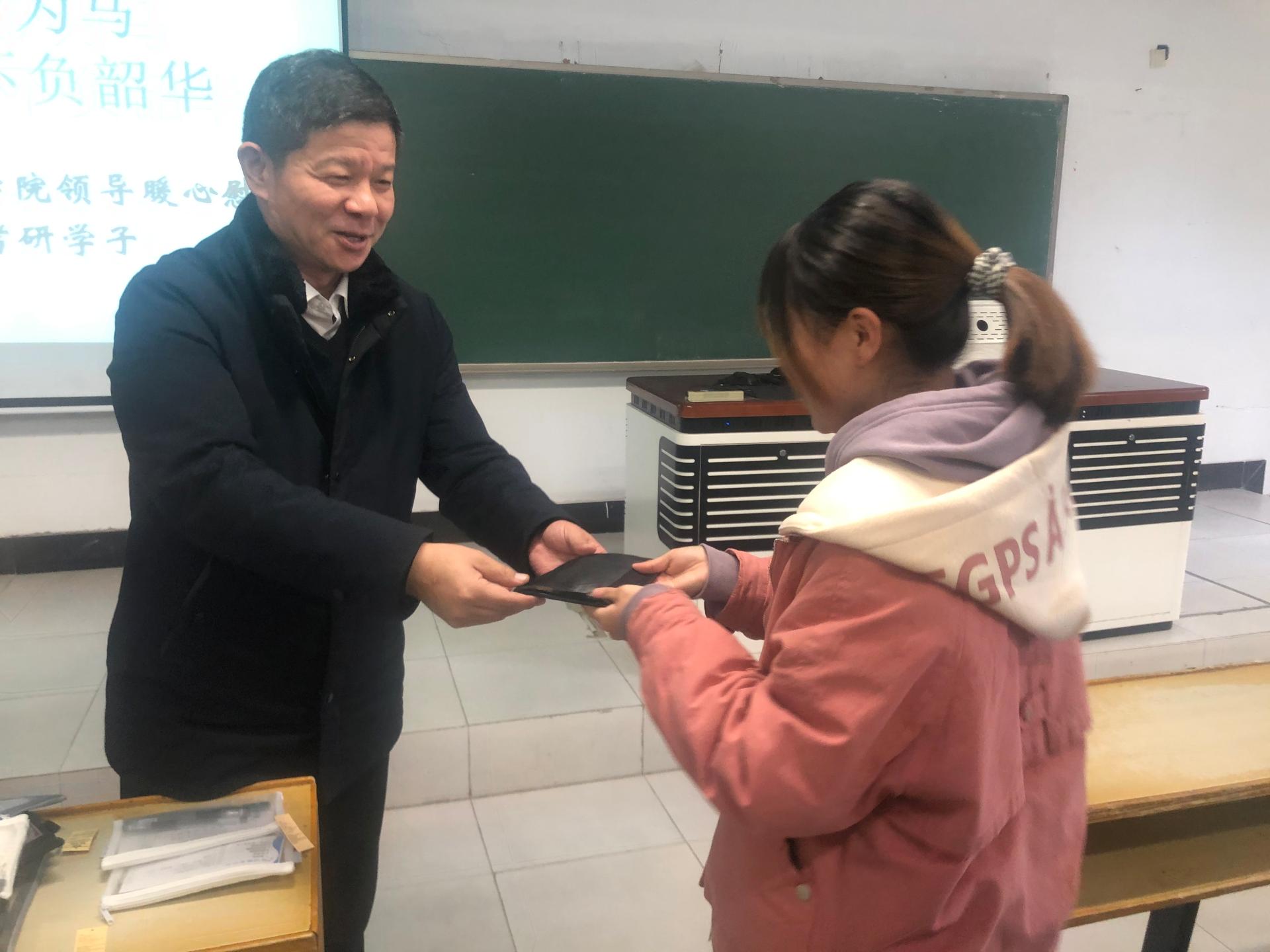随后,各位领导将精心准备的“考试加油包”、“爱心餐券”和2018级、2019级学弟学妹们以及学院领导、老师们手写的祝福贺卡送给同学们,“天道酬勤,金榜题名”、“长风破浪会有时,直挂云帆济沧海”这一句句温馨祝福表达学院对考研学子们的关怀。